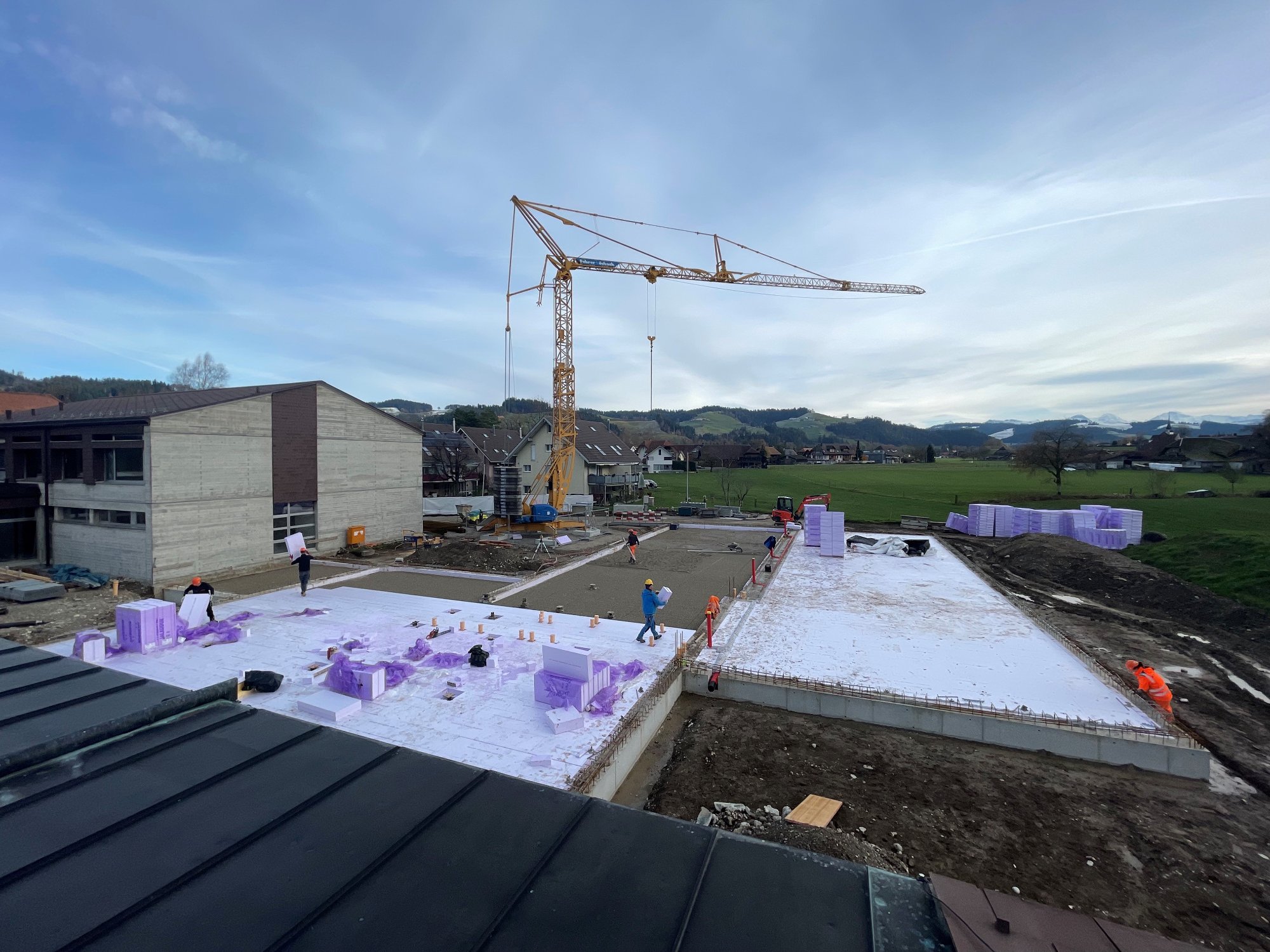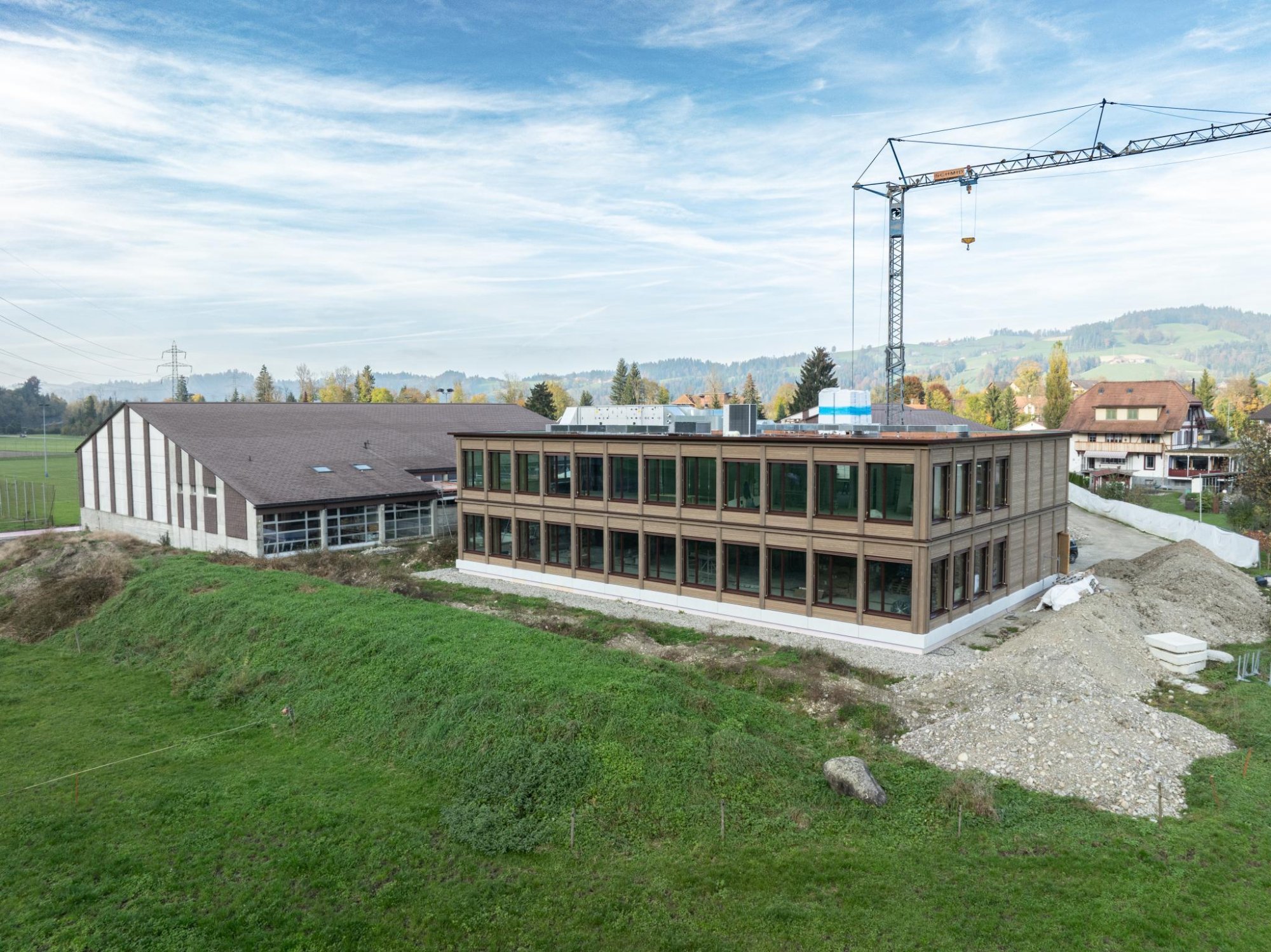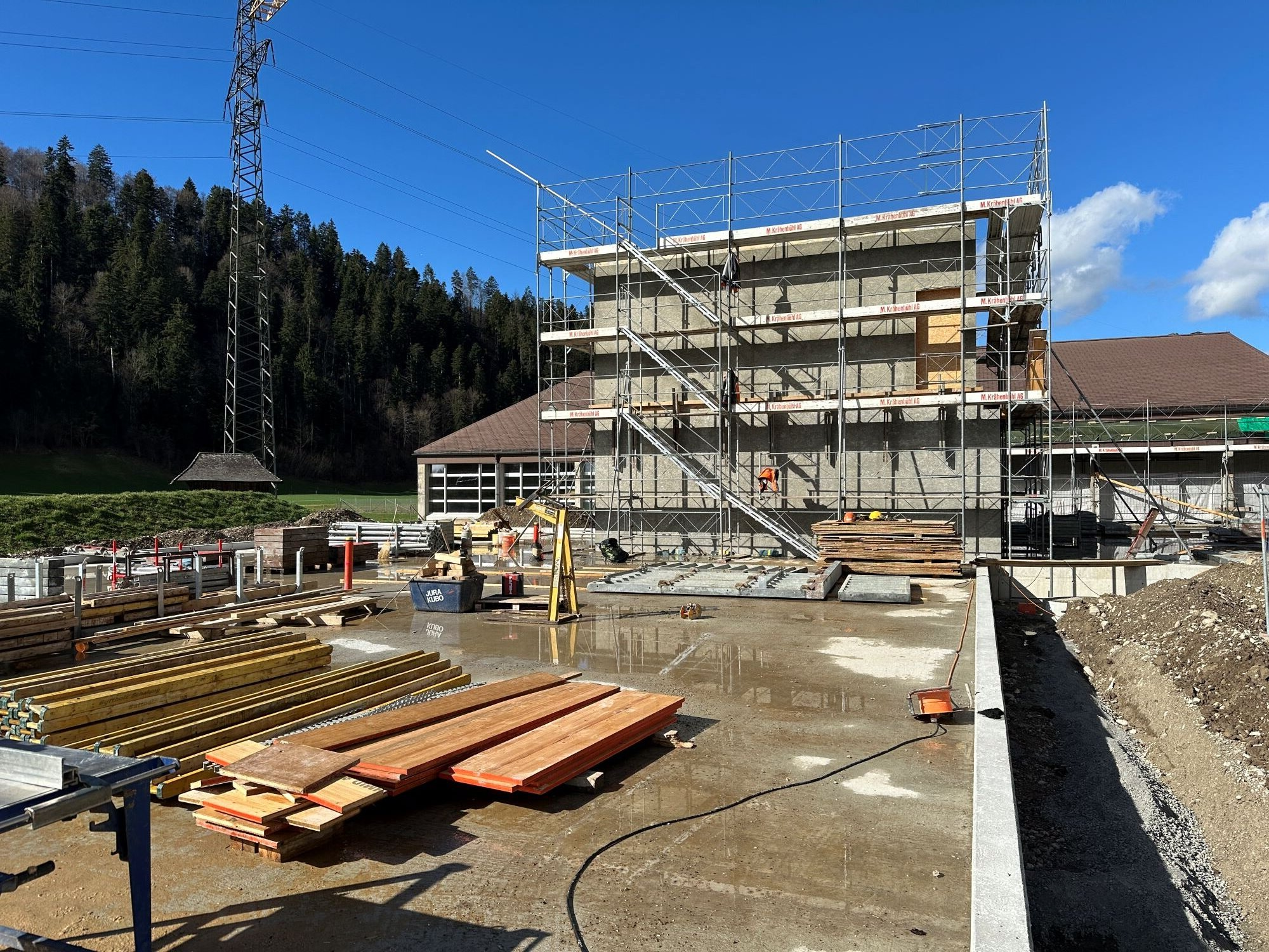 Das bestehende Gebäude wird saniert und erdbebenertüchtigt. Der Neubau wird ab Erdgeschoss in Holzbauweise ausgeführt.