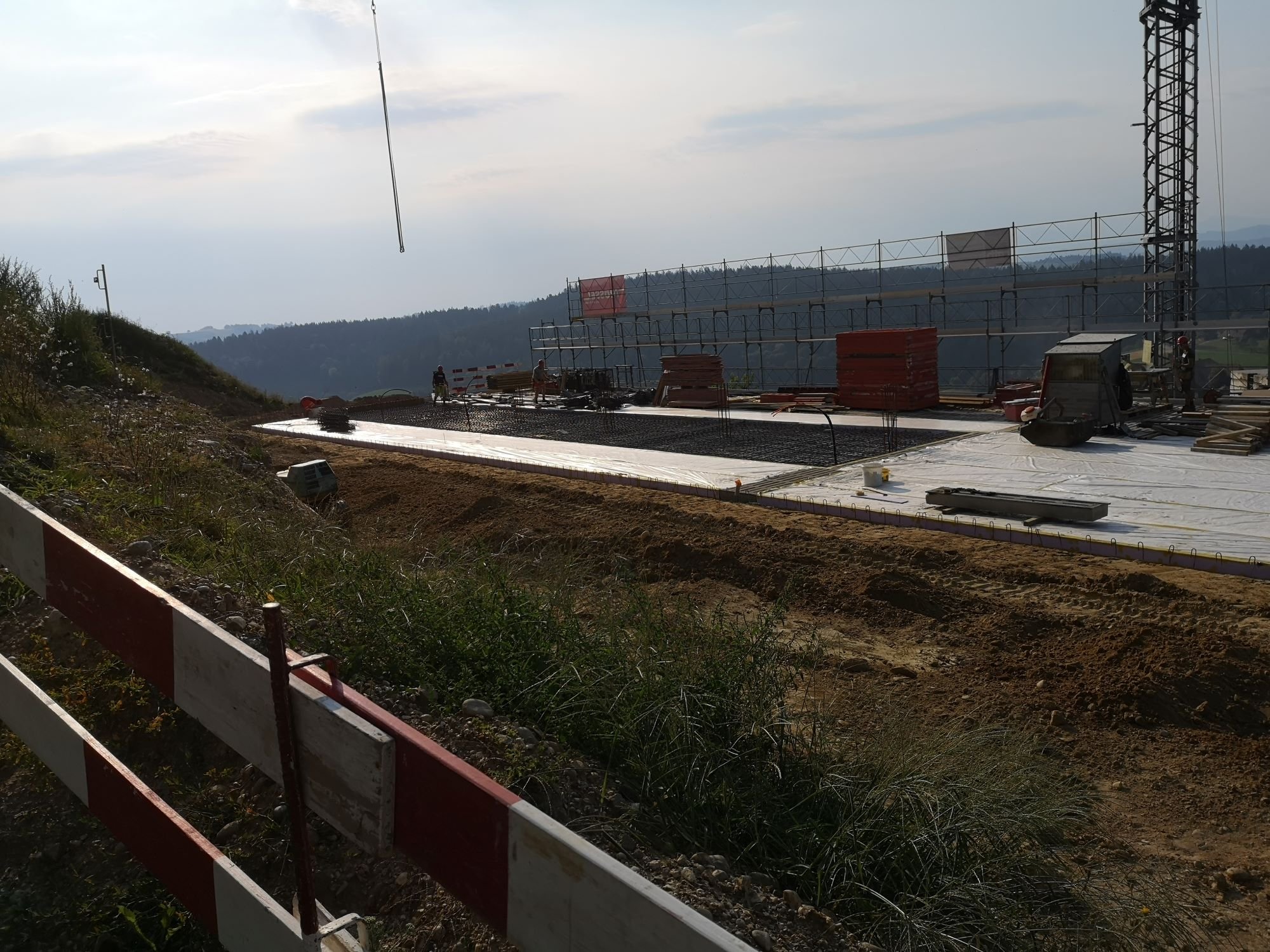 Der Stallneubau hat die Abmessungen von 45.08x20.18m. Bei der Nordostecke wird das Gebäude noch um 3m verlängert. Zwischen den Bindern drei und fünf ist das Gebäude südlich um ca. 13.50x10m einspringend und dient als ungedeckter Laufhof. Westlich befindet sich über dem Stall von der Giebelwand bis zum Binder 3 eine Lagerfläche.